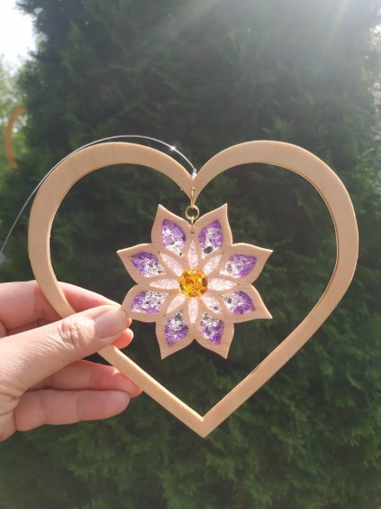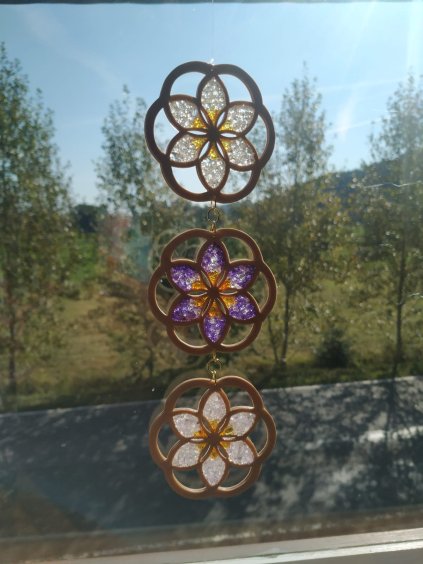 Velikost: 17 cm. Materiál: Březová překližka. Síla: 3 mm. Výplň: Ametyst, Fluorit, diamantový Křišťál, zelený Avanturín. Doplněné skleněnými...