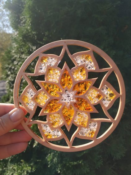 Velikost: 14 cm. Materiál: Březová překližka. Síla: 3 mm. Výplň: Jantar, diamantový Křišťál, Citrín. Doplněné skleněnými microkuličkami. Vhodné do...