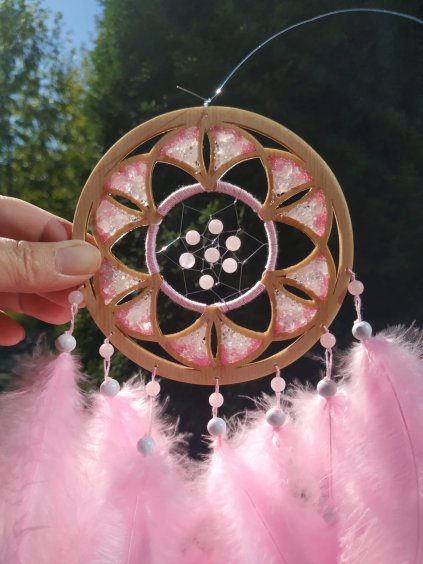 Průměr: 20 cm. Celková délka: 70 cm. Materiál: Březová překližka. Síla: 3 mm. Výplň: Opalit, diamantový Křišťál. Kuličky: Opalit, Křišťál. Peří: Marabu....